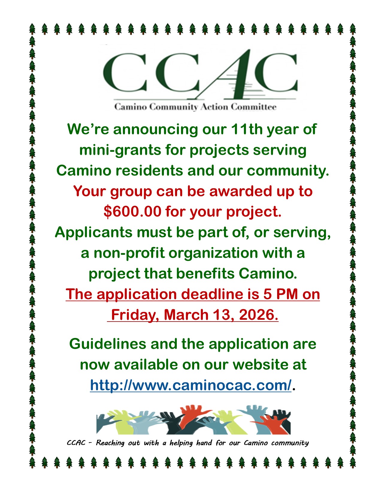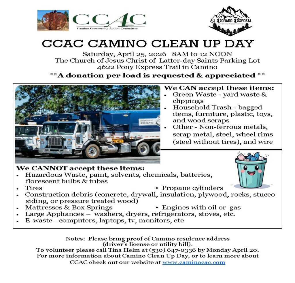 The Camino Community Action Committee (CCAC) is a 501 (c) 3 non-profit whose mission is to preserve Camino, California’s community traditions, history, and architecture and to improve the health, education, welfare, and appearance.